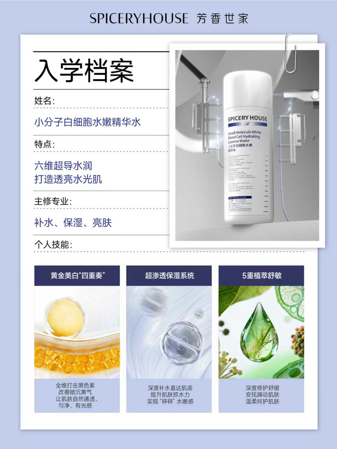 敷完面膜依舊干燥起皮、涂再多護膚品都浮于表面、上妝卡粉斑駁、熬夜后肌膚又干又黃……多少人陷入“表面補水、肌底缺水”的護膚困境?普通精華水要么分子量大難滲透,只能給肌膚“涂一層水膜”;要么只重補水卻忽略屏障修護,導致水分快速流失,終究難以養出真正的水光肌。芳香世家SpiceryHouse小分子白細胞水嫩精華水的到來,以創新“六維超導水潤”體系打破僵局,讓補水穿透肌底、修護直達根源,輕松打造自帶光澤的透亮水光肌。